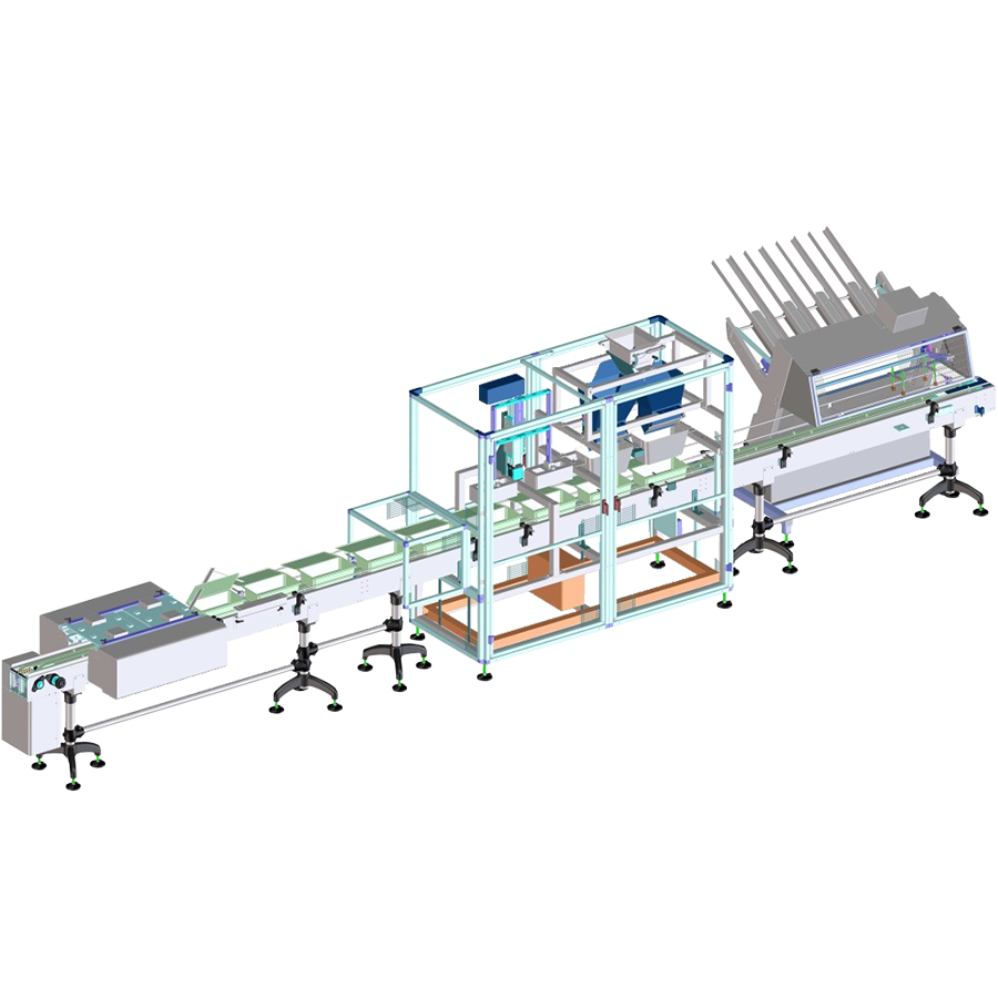 The linear filling system quickly and efficiently fills the clamshell trays with food unwashed or washed fresh and freshly cut products. The system consists of a tray emptier, a double filling and pressing unit and a double lid closing unit.