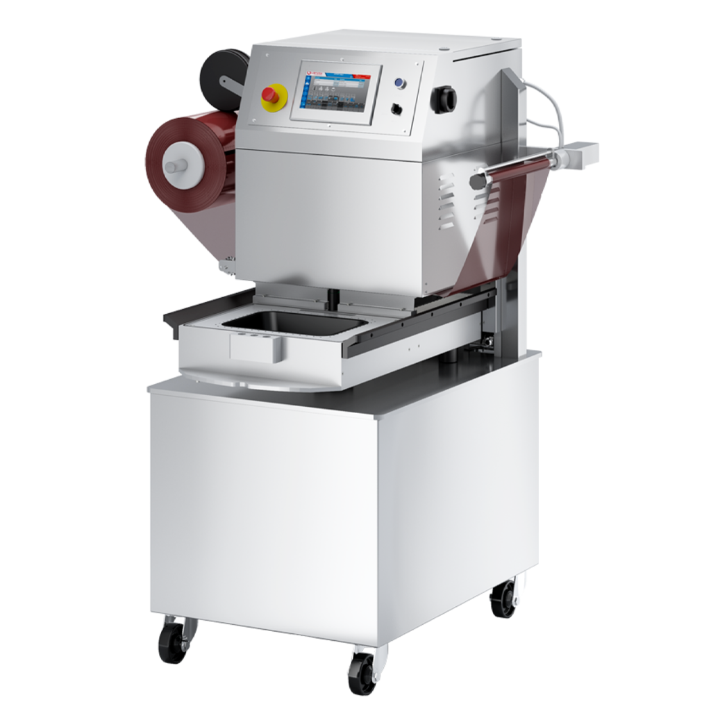 Ημιαυτόματη μηχανή σφράγισης δίσκων mod. TDF 500 για μικρές εκροές παραγωγής, μόνο επιλογές συσκευασίας σφράγισης ή MAP.Ημιαυτόματη μηχανή σφράγισης δίσκων mod. TDF500 AE με περιστροφική μήτρα σετ τραπεζιού για αύξηση της παραγωγικότητας. Κατάλληλο για μικρή παραγωγή για τη συσκευασία υπό κενό, τροποποιημένη ατμόσφαιρα (MAP) ή SKIN με προκατασκευασμένους δίσκους.