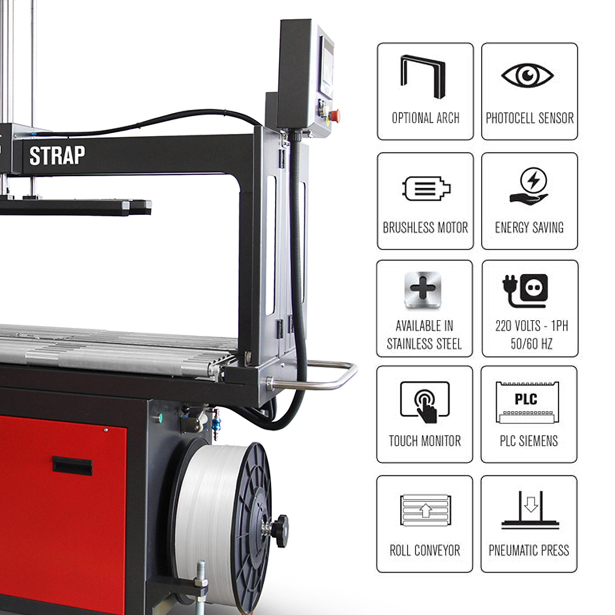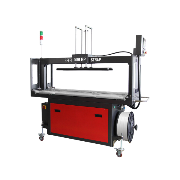 Η σειρά SPEED STRAP 505RP | 509RP | 512RP ανήκει στη γκάμα των πλήρως αυτόματων τσερκοδετικών μηχανών υψηλής απόδοσης, εξοπλισμένων με κινούμενο πάγκο κυλίνδρων και άνω πνευματικό press, για τη σταθεροποίηση των προϊόντων κατά τη διαδικασία δεσίματος.