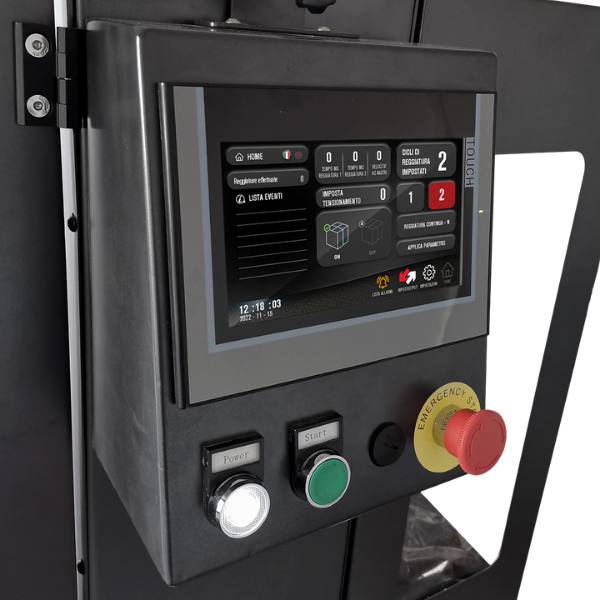 Ο χειρισμός πραγματοποιείται μέσω οθόνης αφής 7,2’’, ενώ ο έλεγχος της μηχανής γίνεται από PLC Siemens, εξασφαλίζοντας ακρίβεια, ευελιξία και υψηλή αξιοπιστία στη συνεχή λειτουργία.