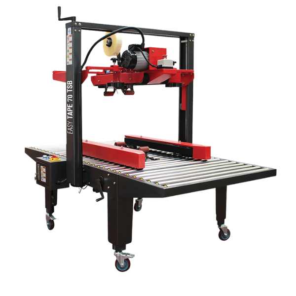 Η EASY TAPE 70 TSB είναι ημιαυτόματη μηχανή ταινιοκόλλησης με χειροκίνητη ρύθμιση διαστάσεων, ειδικά σχεδιασμένη για τη σφράγιση μεγάλων χαρτοκιβωτίων τύπου American (RSC), με αυτοκόλλητη ταινία στο άνω και κάτω μέρος.