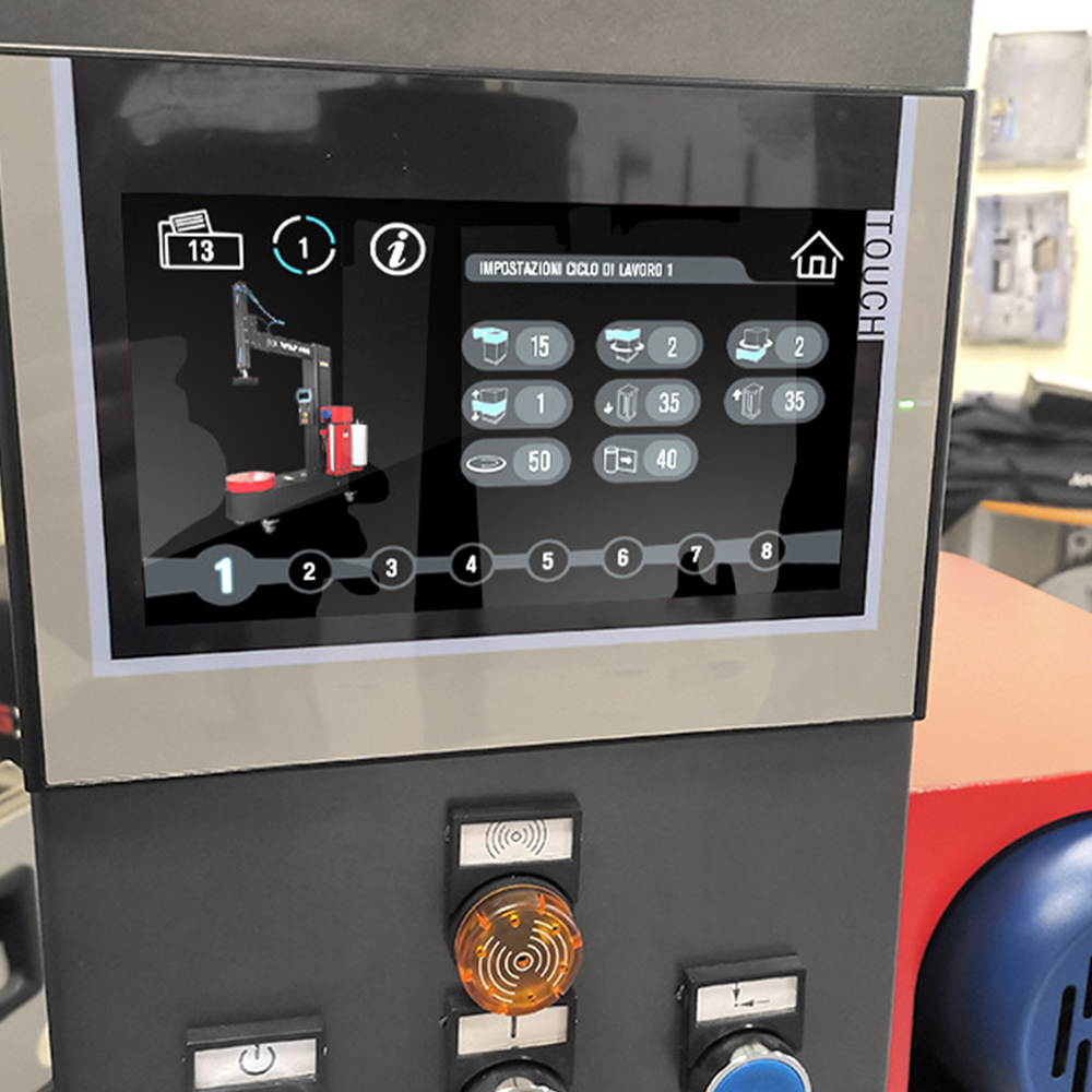 Η μηχανή διαθέτει στιβαρή κατασκευή από βαμμένο χάλυβα και είναι εξοπλισμένη με πνευματικό άνω πιεστήριο (top press) για τη σταθεροποίηση του προϊόντος κατά την περιτύλιξη. Ο έλεγχος πραγματοποιείται μέσω PLC και έγχρωμης οθόνης αφής 7,2”, επιτρέποντας εύκολη ρύθμιση των παραμέτρων και αποθήκευση προγραμμάτων.