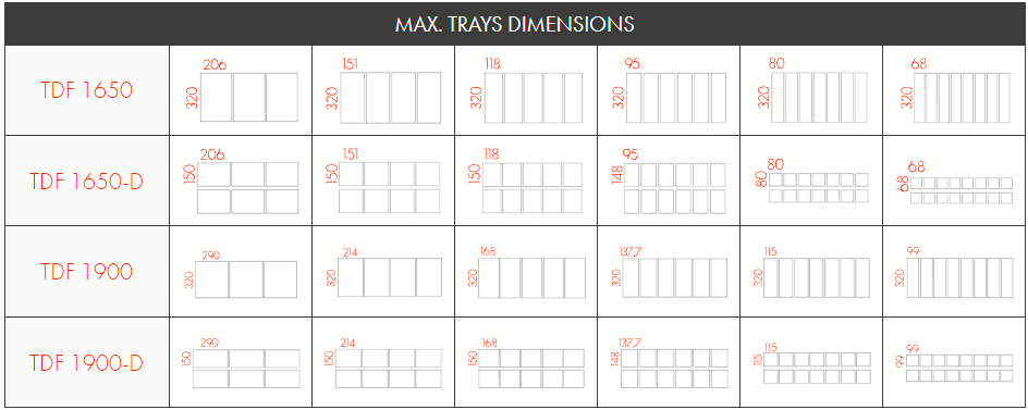 Ολοκαίνουργιο και επαναστατικό πλήρως αυτόματο mod Traysealer. TDF1650 & TDF1900: για τη συσκευασία πλαστικών, χαρτονιού και προσχηματισμένων δίσκων από αλουμίνιο, με καπάκια από πλαστικές μεμβράνες σε καρούλι, καπάκια χαρτοκιβωτίου και δυνατότητα εφαρμογής επανακλεισίματος. Πλαίσιο μηχανής πλήρως κατασκευασμένο από ανοξείδωτο χάλυβα: μεταλλικά φύλλα που λαμβάνονται με κοπή με λέιζερ, ηλεκτρικά συγκολλημένα στοιχεία συγκράτησης.